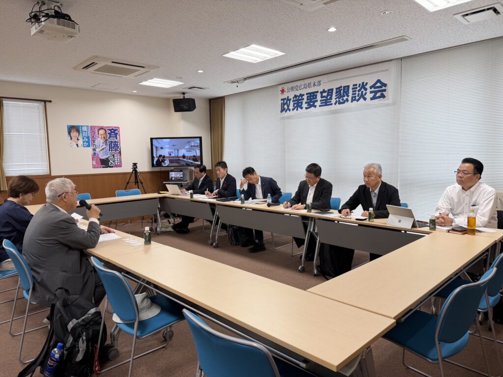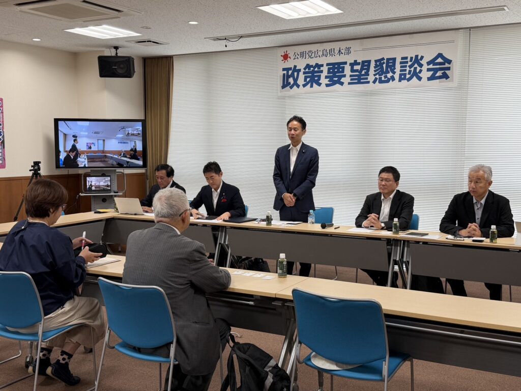 「公明党広島本部・政策懇談会」に参加して参りました。お知らせ, 活動報告 令和7年10月18日(土)公明党広島本部で開催されました「公明党広島本部・政策懇談会」に参加して参りました。 冒頭に「最近、いろいろとお騒がせしてします」とご挨拶されました私たちは、難病担当の役員や委員の声ではなく、難病患者の方の、直のお声をお聞きしたいと思っています!と話され、感激いたしました。 懇談会に参加されていた議員の先生方は、私たちの話に大きく頷いたり、質問してくださったり、私たちの声にとても真剣に耳を傾けてくださっていました。また、広島県、広島市の要望書にも載せています避難所の問題について尋ねてくださり、先日の難病カフェで皆さんのお話にあった不安、心配、現状をお話できました。 これからも難病患者の抱える様々な問題について、お力添えを頂ければ幸いです。また、このような貴重な機会を設けて頂き、心より感謝を申し上げます