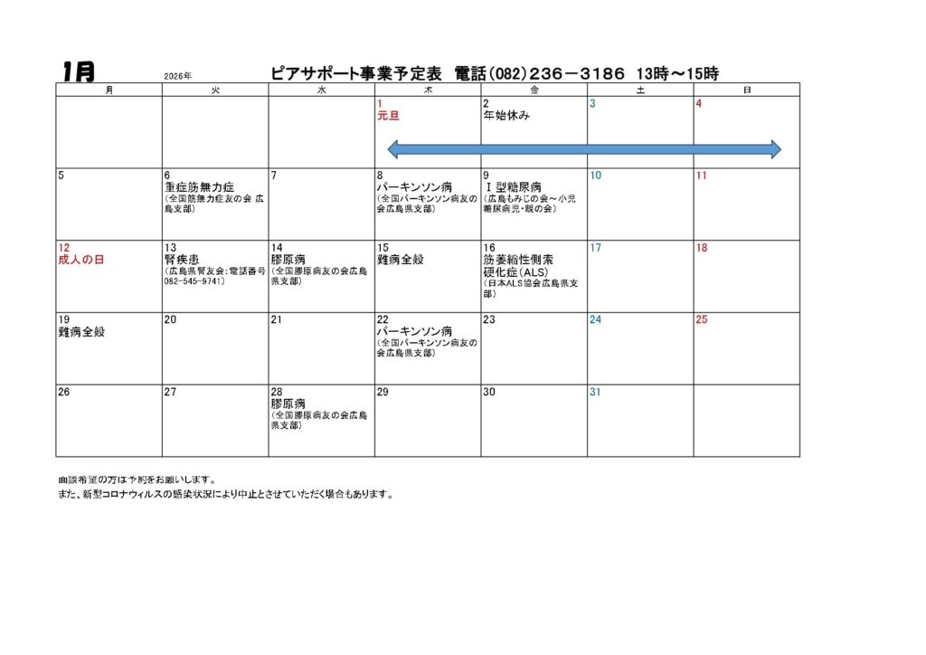 令和8年1月のピアサポート事業のお知らせお知らせ, ピアサポート事業 広島難病団体連絡協議会では、患者や家族によるピアサポート事業を行っています。 相談専用電話 082 -236 -3186 時間 13:00 ~15 :00 当会事務所において、患者や家族が相談に応じます。 同じ病気を持つ患者や家族との対話は、病気との付き合い方を知るきっかけとなり、 また不安の言葉を素直に言える存在として…。 思っている以上に有意義な相談になるのです。 一人で悩まないで、お気軽に電話してみてください。 面談での相談をご希望の方は、事前に予約をお願いします。(082−236−1981)