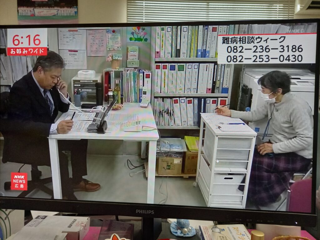 2026年 難病ウィーク報告お知らせ, 活動報告 厳しい寒さと 突然の衆議院選挙のあわただしさの中で、今年の難病相談が始まりました。秋から各患者会の皆さんと準備した5日間の難病相談です。相談は42件(面談4 メール12 電話26)で、内容は 病気について、療養するための福祉·年金制度、災害時の支援 他 多岐に渡つていました。 担当の医師や専門家による回答は、難病患者さんの不安に寄り添い、前向きに暮らしてゆく助けになったと確信しており 心から感謝しています。NHKのニュースや中国新聞、広島市の市民と市政には毎年取り上げてもらつており、相談ウイークを知らない難病患者さんに、もっと繋がりたいと願ってやみません。回答を引き受けて下さった医師 専門家の皆様、各患者会の皆さまお忙しい中 ご協力を有り難うございました。 浜岡和子