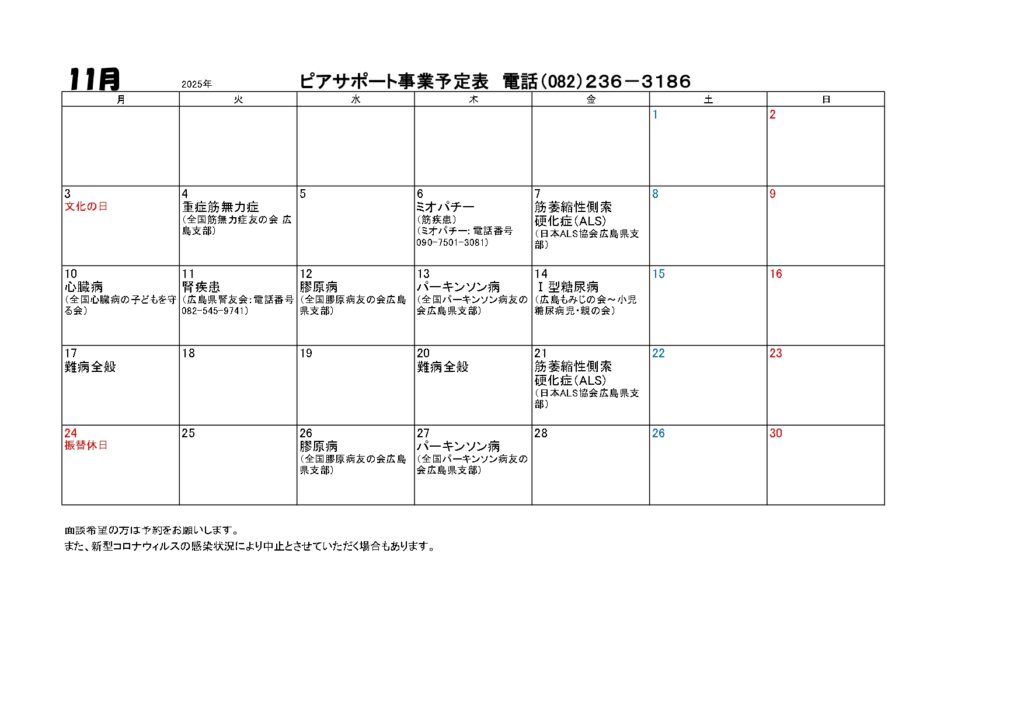 令和7年11月のピアサポート事業のお知らせ お知らせ, ピアサポート事業 広島難病団体連絡協議会では、患者や家族によるピアサポート事業を行っています。 相談 専用 電話082 -236 -3186時間 13:00 ~15 :00当会事務所において、患者や家族が相談に応じます。同じ病気を持つ患者や家族との対話は、病気との付き合い方を知るきっかけとなり、また不安の言葉を素直に言える存在として…。思っている以上に有意義な相談になるのです。一人で悩まないで、お気軽に電話してみてください。面談での相談をご希望の方は、事前に予約をお願いします。(082−236−1981) 令和7年11月のピアサポート事業のお知らせ 続きを読む »