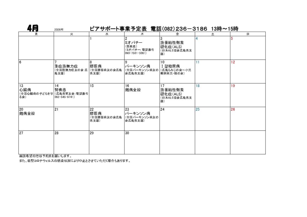 令和8年4月のピアサポート事業のお知らせ お知らせ 広島難病団体連絡協議会では、患者や家族によるピアサポート事業を行っています。相談専用電話082 -236 -3186時間 13:00 ~15 :00当会事務所において、患者や家族が相談に応じます。同じ病気を持つ患者や家族との対話は、病気との付き合い方を知るきっかけとなり、また不安の言葉を素直に言える存在として…。思っている以上に有意義な相談になるのです。一人で悩まないで、お気軽に電話してみてください。面談での相談をご希望の方は、事前に予約をお願いします。(082−236−1981) 令和8年4月のピアサポート事業のお知らせ 続きを読む »