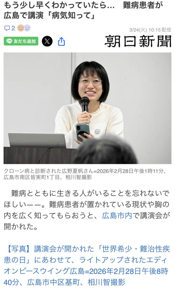 【メディア掲載のお知らせ】RDDin広島での講演内容について お知らせ, 活動報告 2026年2月28日 RDDin広島での講演内容について、朝日新聞に掲載頂きました。このような貴重な機会をいただき、多くの方々に本講演の内容をお届けできたことを大変光栄に思っております。掲載を通じて、より一層理解や関心が広がり、今後の活動や取り組みにつながっていくことを願っております。今後も引き続き、情報発信と社会への貢献に努めてまいります。 ⇩当記事は以下ボタンをクリック ここをクリック 【メディア掲載のお知らせ】RDDin広島での講演内容について 続きを読む »