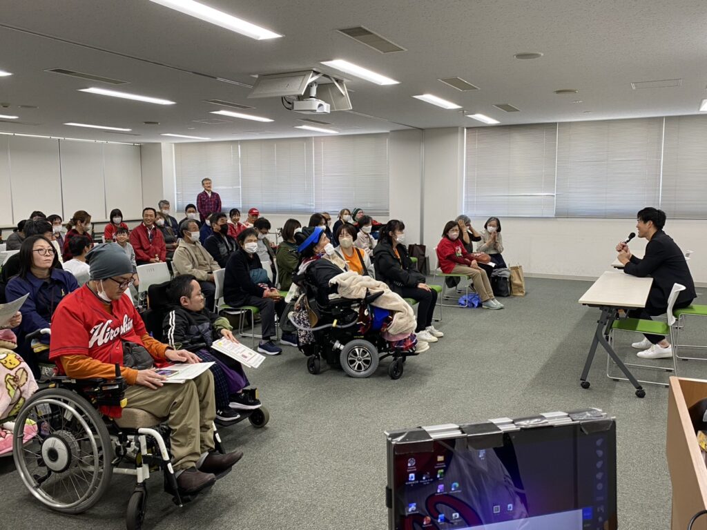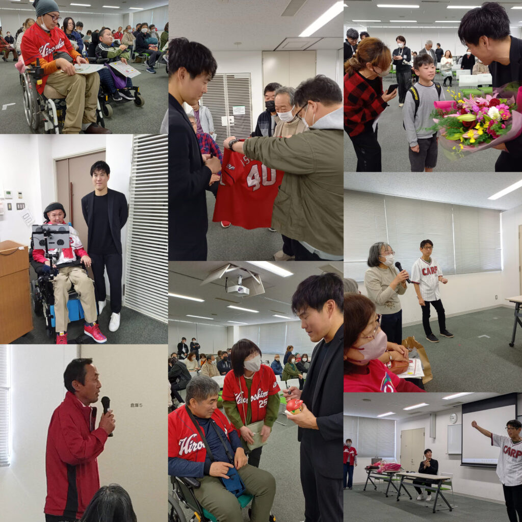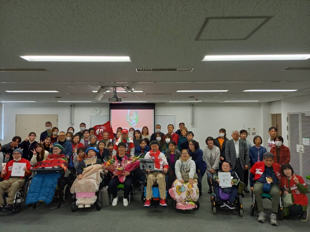 令和7年11月30日(日)「広難連加盟団体交流会」 活動報告 お知らせ, 活動報告 令和7年11月30日(日)に佐伯区地域福祉センターで開催された「広難連加盟団体交流会」の楽しい様子をお伝えします。 ●第一部:磯村選手と交流第一部では、日本ALS協会 広島県支部 三保支部長のご友人である広島東洋カープの磯村選手がゲストとして参加してくれました!参加者の皆さんは、磯村選手と一緒に楽しい交流をしながら、笑顔あふれる時間を過ごしました。質問コーナーでは、野球ファンならではの質問が飛び交い、磯村選手も野球の裏話を披露してくれました。皆さん、興味津々で聞き入っていました。磯村選手との交流コーナーでは、長蛇の列になり色紙、ユニフォームにサインとして頂いたり、花束を渡したり、一人一人に丁寧に接っして下さる姿に磯村選手の人柄があふれていました。 来季に向けて応援!磯村選手のご家族に難病患者がおられることもあって、磯村選手は私たちの気持ちにも寄り添ってくださり、これまでにも病院訪問や球場への車椅子使用者を招待するなど、多くの暖かい支援をしてくださっています。磯村選手は、来季から新しい人生の第2ステージを歩まれるとのこと。そこで、久保事務局次長が応援団長となり、皆で精一杯応援しました。その際に磯村選手が「初めて、こんな間近で応援する姿を見ました!」と驚きの笑顔を見せてくれたことは、参加者全員にとって忘れられない瞬間でした。 ●第二部:レクリエーションで交流続いての第二部では、広島国際大学の学生さんが準備したレクリエーションが行われました。加盟団体同士での紹介やゲームを通じて、みんなで盛り上がり、心温まるひとときを過ごしました。参加された皆さんの輝く笑顔と、磯村選手の笑顔が宝物のような、今年最後を飾る広難連のイベントとなり、本当に素晴らしい日でした来年も、さらなる交流の場としてこのようなイベントが開かれることを楽しみにしています!皆さん、これからも応援よろしくお願いします! 令和7年11月30日(日)「広難連加盟団体交流会」 活動報告 続きを読む »