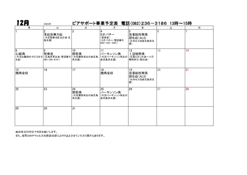 令和7年12月のピアサポート事業のお知らせ お知らせ, ピアサポート事業 広島難病団体連絡協議会では、患者や家族によるピアサポート事業を行っています。 相談 専用 電話082 -236 -3186時間 13:00 ~15 :00当会事務所において、患者や家族が相談に応じます。同じ病気を持つ患者や家族との対話は、病気との付き合い方を知るきっかけとなり、また不安の言葉を素直に言える存在として…。思っている以上に有意義な相談になるのです。一人で悩まないで、お気軽に電話してみてください。面談での相談をご希望の方は、事前に予約をお願いします。(082−236−1981) 令和7年12月のピアサポート事業のお知らせ 続きを読む »